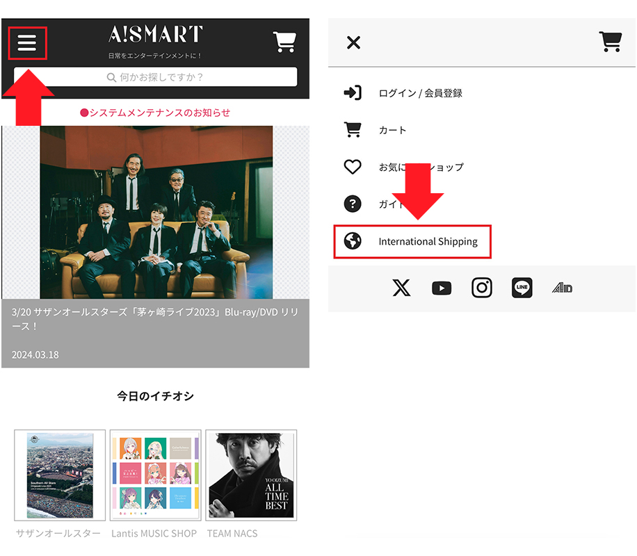スマートフォン向けページでは、左上にあるメニュー「≡」をタップし、「International Shipping」から、海外向け配送サイトへお進みいただけます。