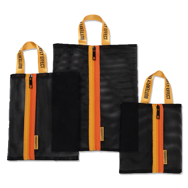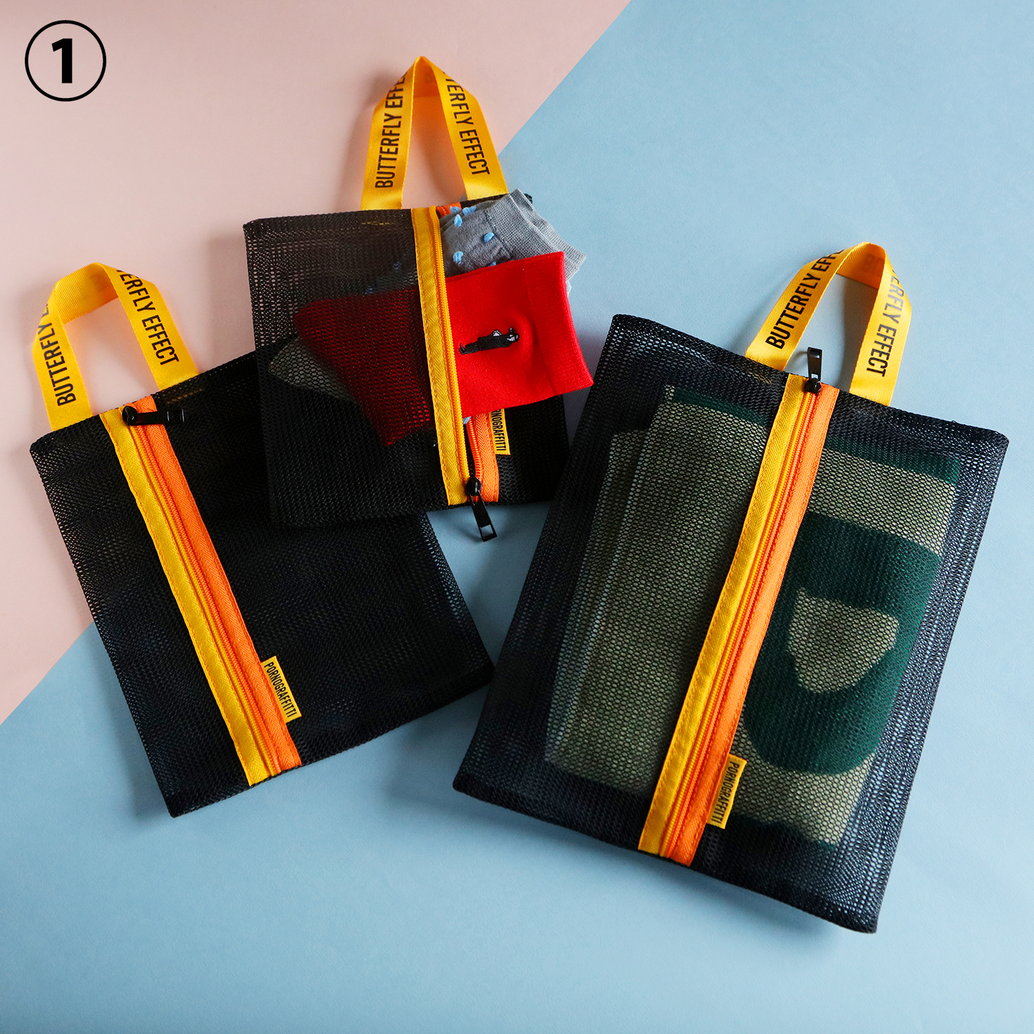 3種類のメッシュポーチがセットに。中身がうっすらわかる、ほどよい透け感で使い勝手◎。