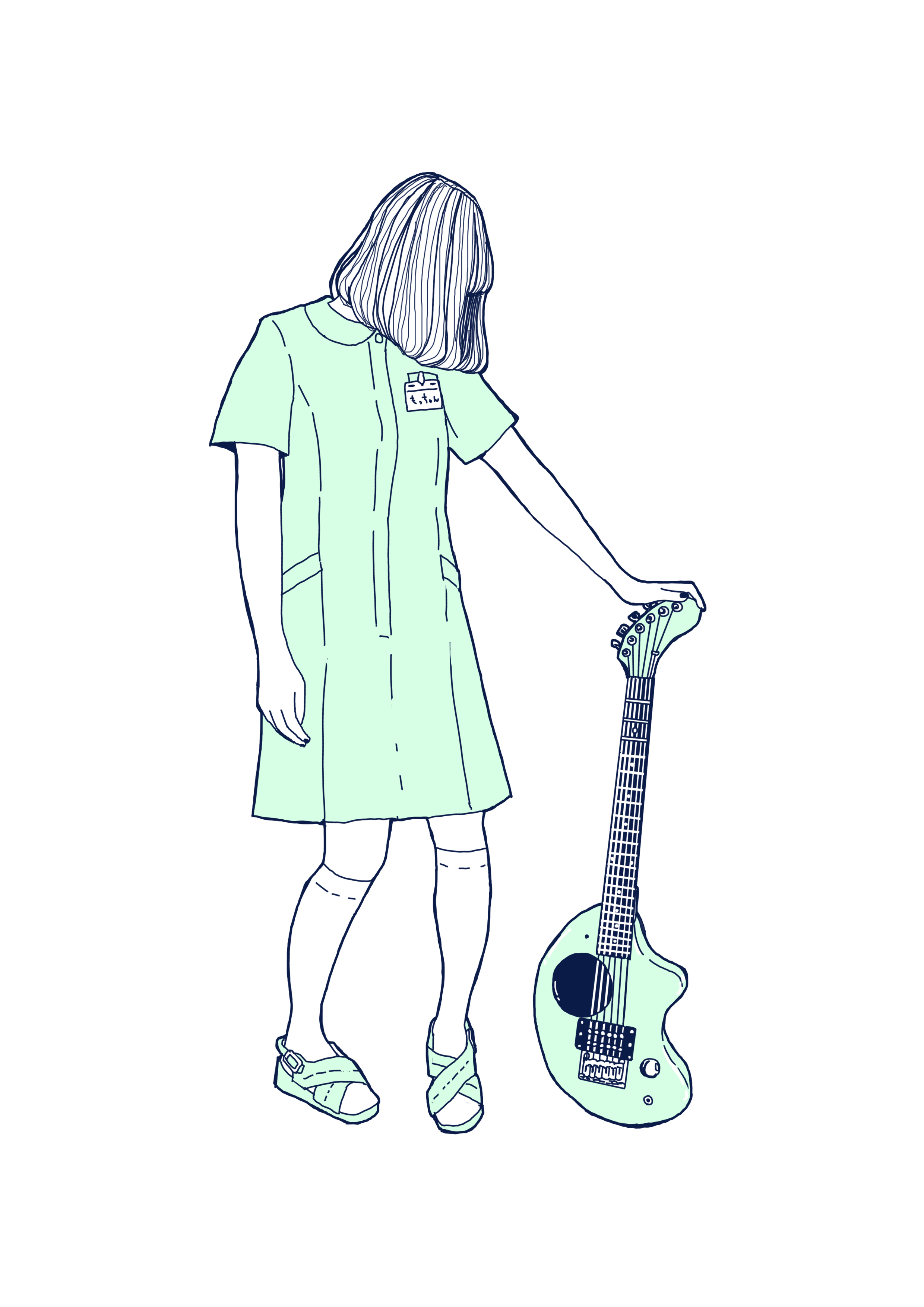 どうしよう(笑)。じつは、高校生のときにギターを買ったんですが、練習をしてみて自分の才能のなさに気づいちゃったんですよね。絵だったら、周りの人よりは上手く描けるなっていう自負があるんですが、音楽は全くダメで(笑)。カッコイイ人たちをたくさん見ているぶん恥ずかしくて、これはもう聴く専門にしようと思ったんです。特に、大学の終わり頃からフクザワの名前でイラストを描く活動を本格的にやり始めたんですが、その頃から「わたしは絵で勝負する、音楽は絶対やらない!」って決めたんですよ(笑)。