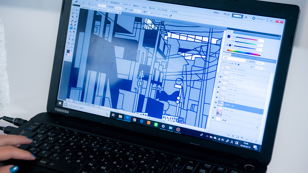 (背景の写真をベースに線画を描き起こしながら)だいたいそうですね。昔は細ければ細いほど現実に近づく気がしていたんですが、あるとき友人から「細すぎる気がする」って言われて、謎なんですけど納得しちゃって。いまはこの細さが多いですね。