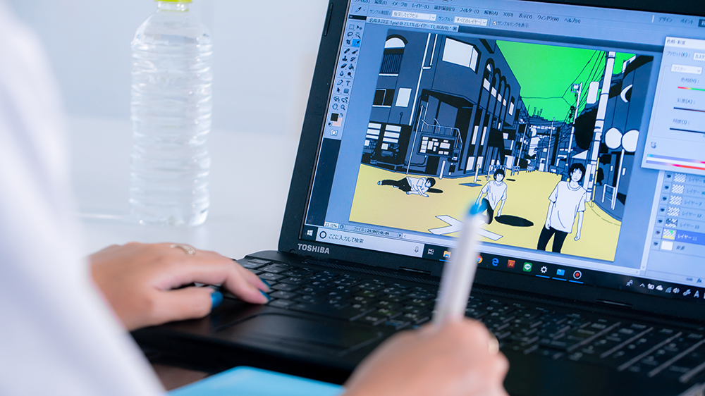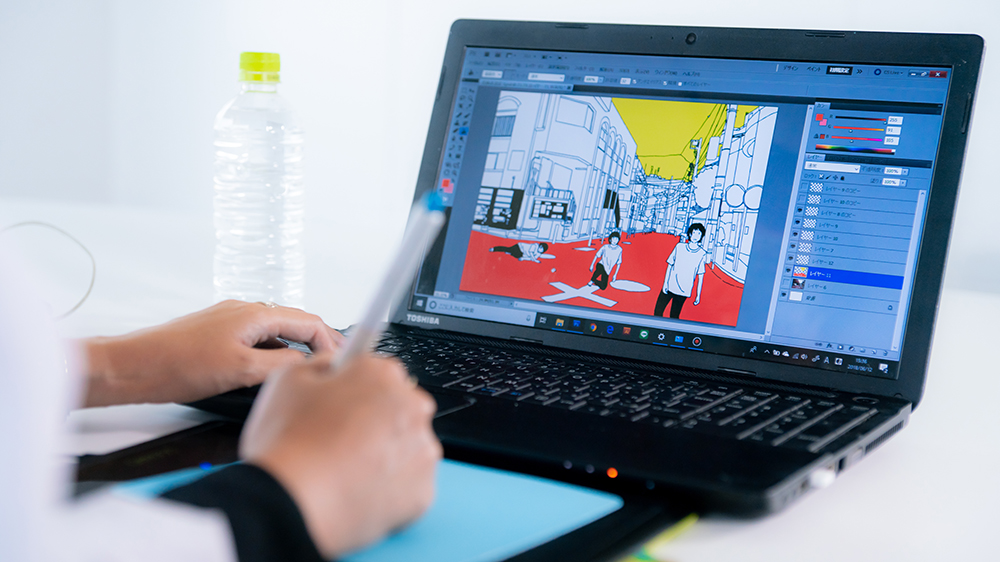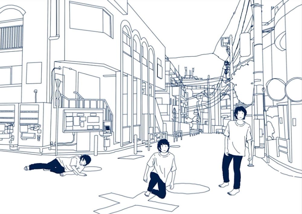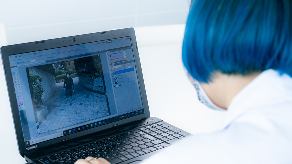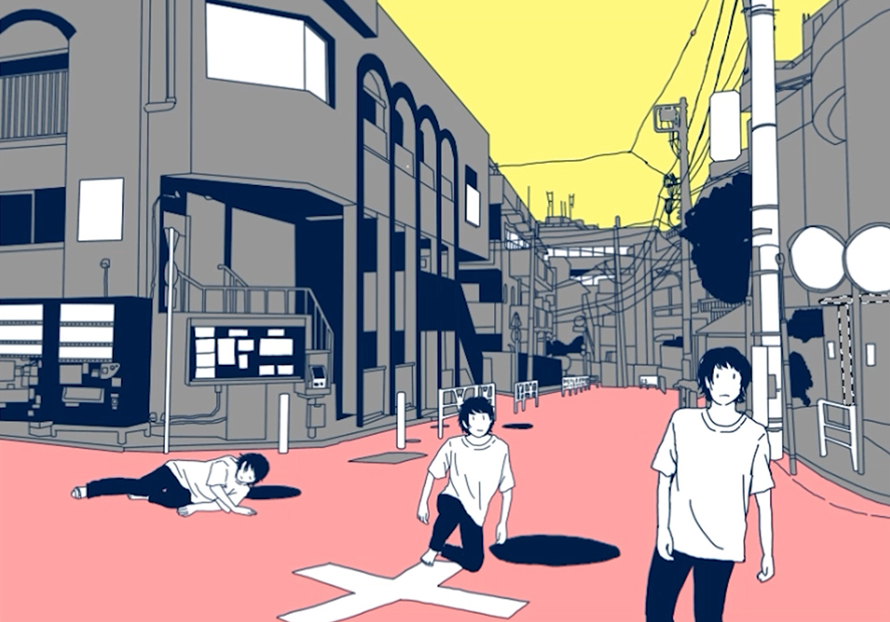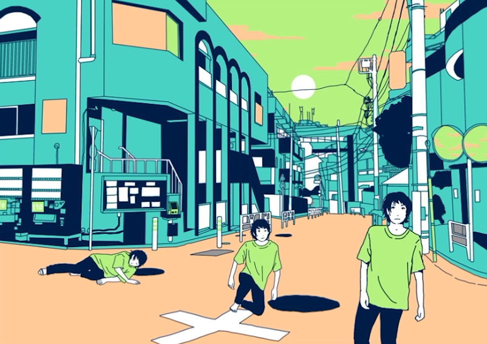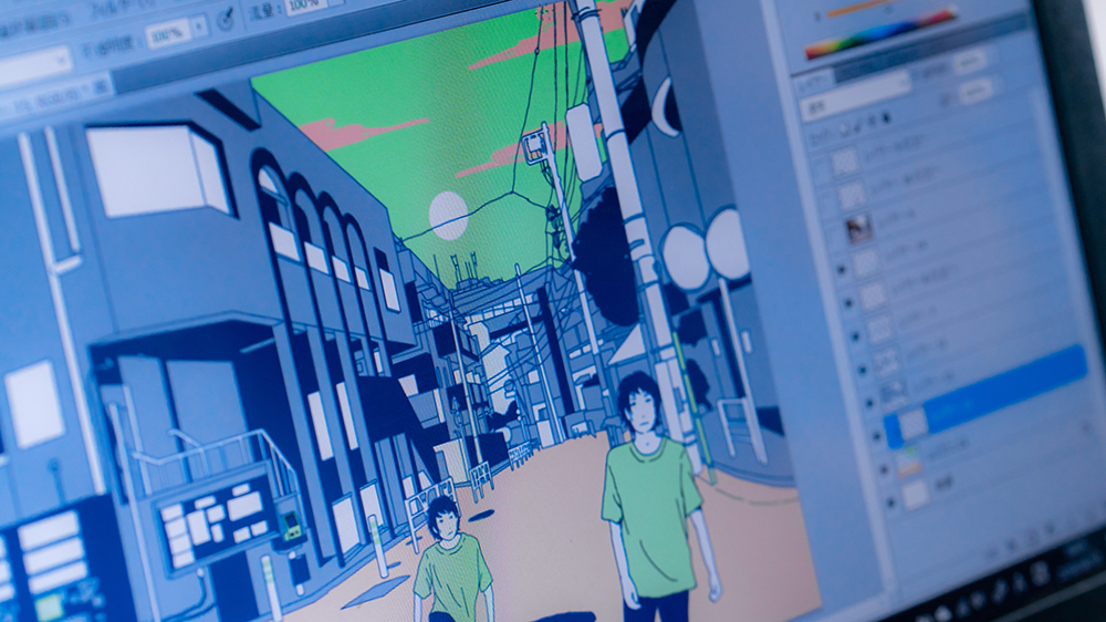 そうですね。現実感を大切にしつつも、現実的過ぎても面白くないので、色づけでは非現実性を出したいですね。(空の色、道路の色、建物の色をピンクや黄色など何度も変えながら)曲が持つ、ドロっとしているところも表現したいですし。こんな感じかな……。