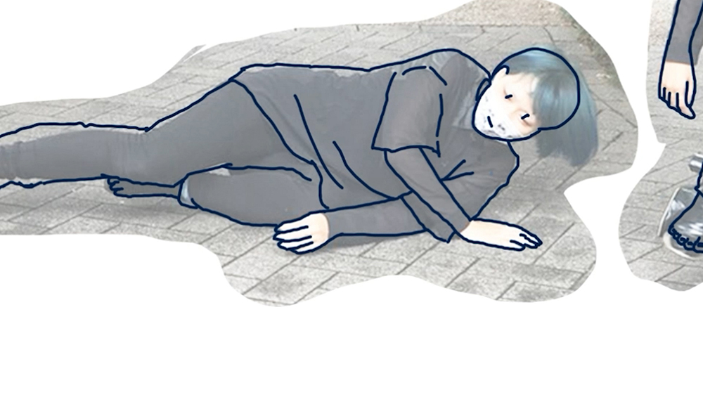 そうです。こんな普通の街並みに人が倒れているのがシュールで面白いなって思って。(数枚の街並みの写真を見比べながら)うーん、どっちにしようかな……この白十字マークが効いているから、こっちにしましょうか!