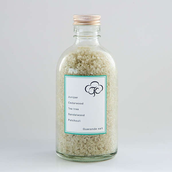 ジュニパー、シダーウッド、ティーツリー、サンダルウッド、パチョリと、3種類のバスソルトの中で一番多く精油の種類をブレンドしています。