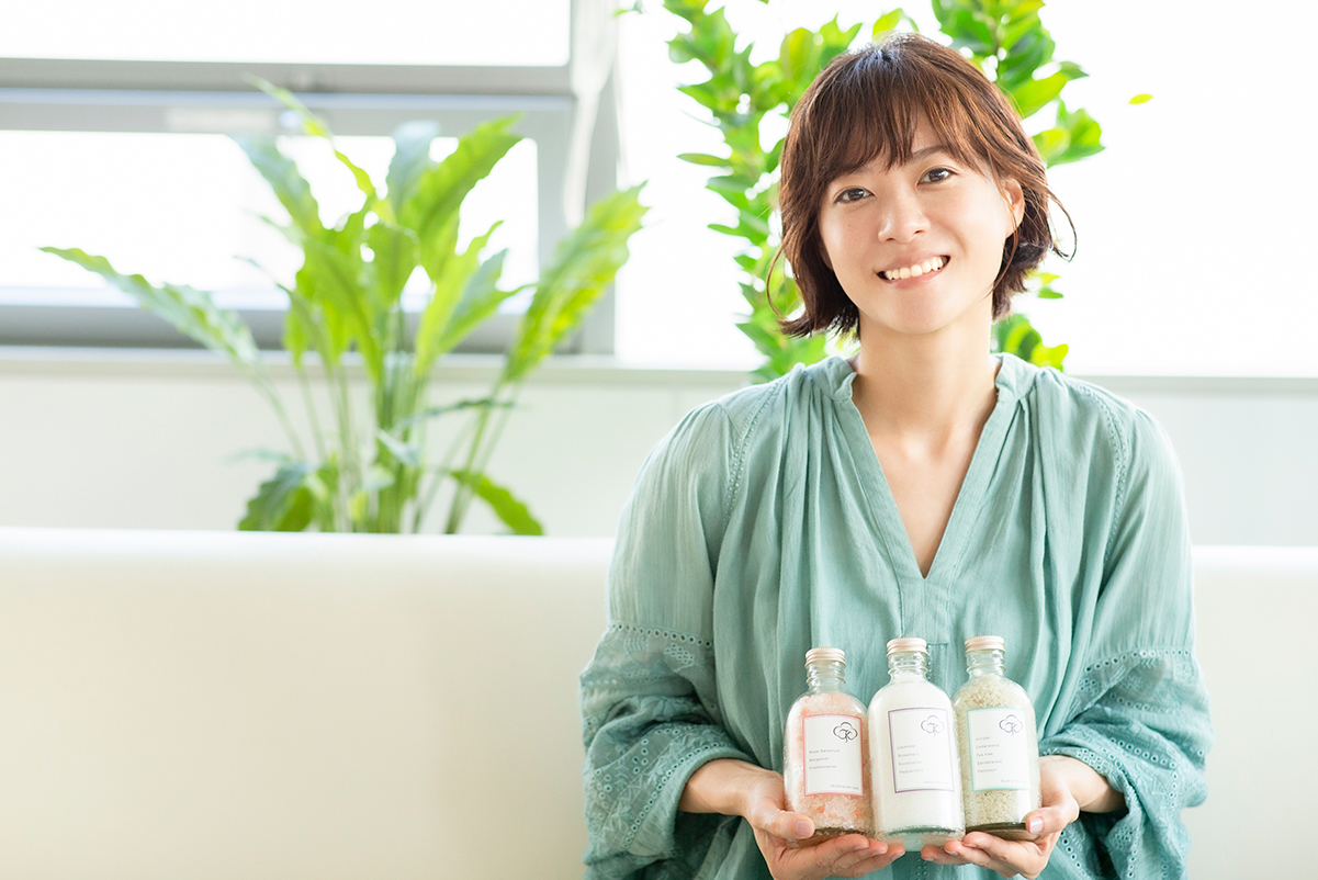 第1弾のアロマキャンドルに続き、発売になったのは「自分好みの香りで、100%天然素材を使った、本当に自分が安心して使えるものを作りました」と上野のこだわりが詰まった3種類のバスソルト