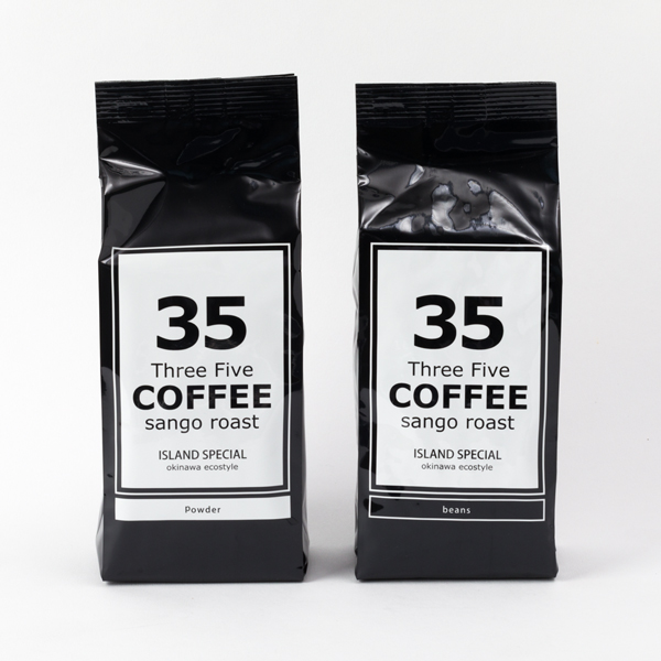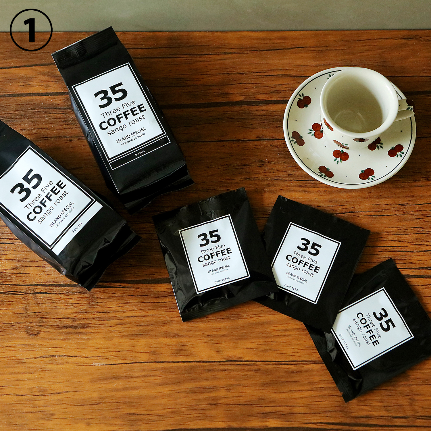 ①沖縄のサンゴで焙煎した話題のコーヒー「35coffee」で、のんびりリラックスタイム。売上の3.5%が、沖縄の海のサンゴ再生プロジェクトに充てられます。