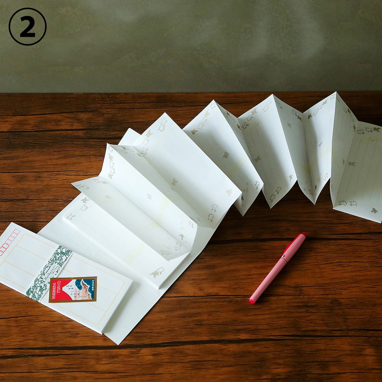 ②日本橋にある和紙の老舗「榛原」の蛇腹便箋で、あの人にお手紙タイム。