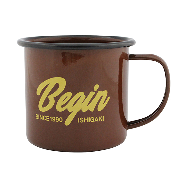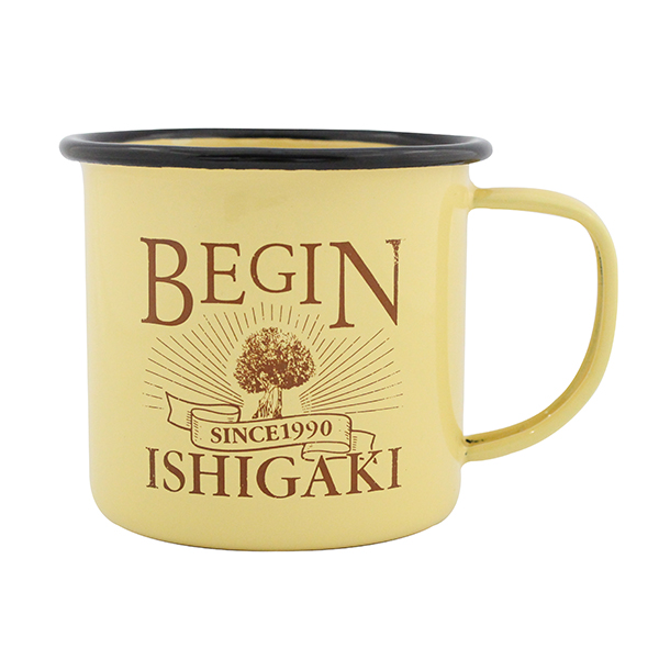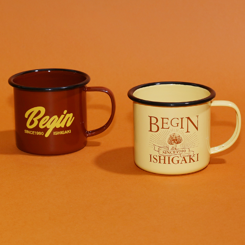 「BEGIN」グッズのマグカップは、軽くて熱に強いホーロー素材。