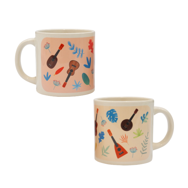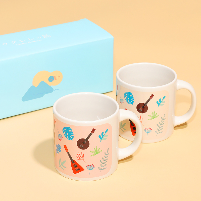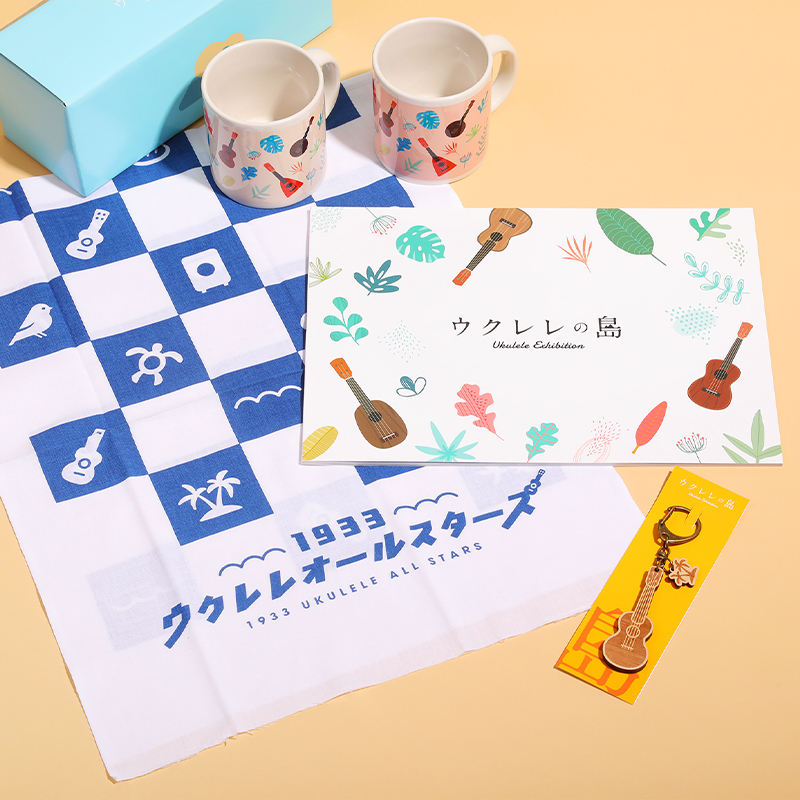 ウクレレの魅力を堪能できるパンフレットのほか、ペアマグカップや木製キーホルダー、手ぬぐいなど、あたたかみのある毎日使いたいアイテムが揃いました。
