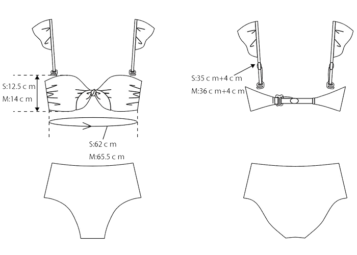バンドゥタイプの水着は、締め付け感が少なく、ナチュラルに着こなすことができるデザインになっています。トップのリボン・フリルのついたストラップは取り外し可能なので、「甘め」にも「シンプル」にもカスタマイズが楽しめます。肌なじみ良く、甘すぎない印象のニュアンスカラーは、石田ニコルこだわりのセレクトです。